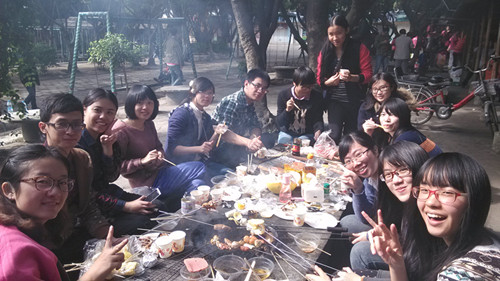 早上八点半,大家带着前一天购买的各种食材和用具,怀着轻松愉悦的心情出发。或许是因为路途遥远,大约十点半到达目的地以后,大家就迫不及待地准备烧烤。男生们负责用木柴和炭生火,与此同时,女生们帮忙洗蔬菜,并把鸡翅、肉丸等串起来,待炉子里的火由星星点点变大以后,大家左右手并用开始烧烤,等待香味扑面而来。很快就看见烧烤网上铺满了各种食物,土豆、丸子、馒头等等,各式各样,其中被烤的金黄可口的鸡翅最受欢迎,而烤过的棉花糖也有独特的口感。烧烤网下也有用锡箔纸包着烤的玉米,虽然几次失败烤成焦炭的样子,让大家哭笑不得,但成功的烤玉米还是十分美味。