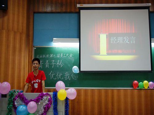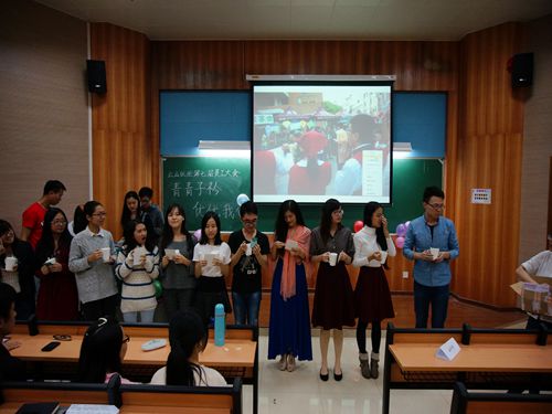 本网讯11月21日星期五晚七点三十分,广外云山优座咖啡屋(北,下简称“优座”)在七教107教室举行了以“青青子衿,优优我心”为主题的优座第七届员工大会。该主题寓意着优座求贤似渴,竭诚欢迎新员工的加入。本次员工大会主要环节有:嘉宾发言、新员工自我介绍、离退员工发言、财务部人资部基本知识培训、赠送礼物以及游戏环节等。主持人在台上妙语连珠,优座的新老员工们在台下反应热烈,整场大会高潮迭起。