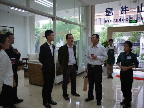 刚主持完活动的校党委副书记陈建平受邀到书屋内部参观。在学生处副处长何越晖、书屋经理谢文凯与副经理郑雪华的陪同下,陈书记品尝了书屋出品的饮品,在教师专著的特色展区前驻足,聆听书屋员工对该展区的详细介绍。