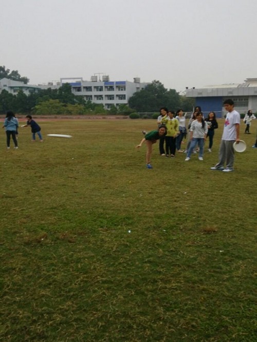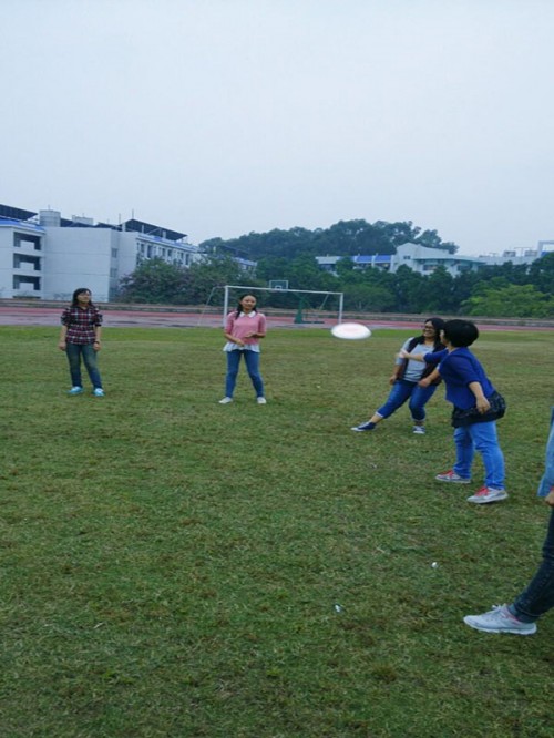 热身完毕,飞盘协会的师兄师姐向我们介绍了飞盘的玩法,并做亲身示范——只见一白色圆盘自师兄手中弹出,团团飞旋,瞬如电光,翩若飞鸿,在空中划出一道极优美的弧线;对面的师姐眼疾手快,抬手之间 上一秒还在空中飞转的白盘儿便已擒在掌中——果然身手不凡,帅! 同学们不由齐声喝彩叫好,同时摩拳擦掌,真是恨不能立刻换自己上场去啊。