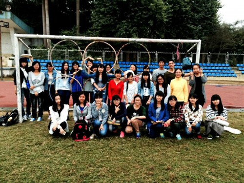 师兄不敢辜负同学们的热情,简单介绍了活动的三个环节后,便宣布第一环节开始。此环节中,同学们站成三列,依次在这挂着上下各三个呼啦圈的架子前立定,朝圈中投飞盘。由于同学们大多数是第一次玩飞盘,既兴奋又有点小紧张,因此既有锦碧师姐这样三投三中 一举飞出6分(满分)的高手,也难免有投了几次也没扔准的小菜鸟——但不管怎样同学们都非常开心,还有人直感慨“没玩够”。