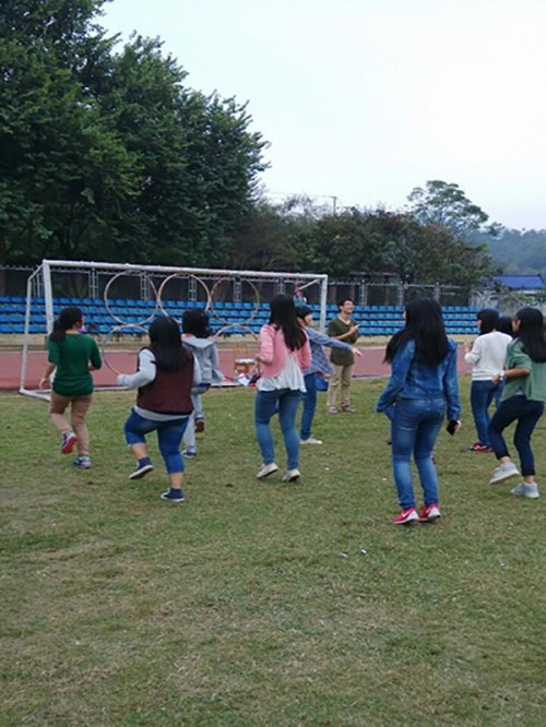 第二环节乃是小组合作。三个小组,每组一个飞盘,各自站成圈,组员间相互投掷飞盘,若飞盘落地则游戏结束,而令飞盘飞最久的小组将获胜。最后雪燕组凭着飞盘五分多钟不落地的好成绩完胜,获得奖品。