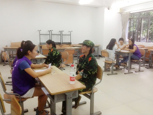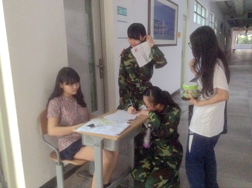 前来面试的人群中有穿着军装的大一新生。“小绿人们”趁午休空隙,急匆匆从饭堂赶来面试。有的手持精心准备的简历,自信满满地在面试室外等候,时而喃喃自语,将待会要讲的东西重新温习一遍,时而低头思考,斟酌可能的面试提问;有的则不停摇着手里的军帽,稚嫩的脸上流露出“初生牛犊不怕虎”的自信。