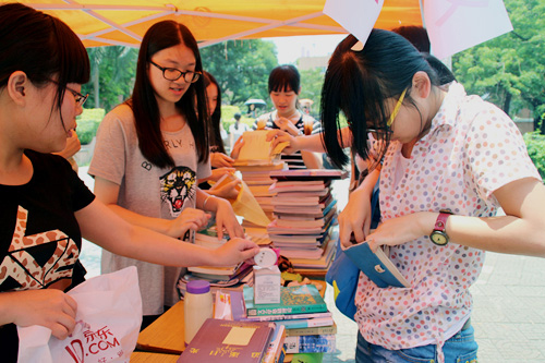 本网讯:2014年6月13日,云山爱满屋(北,以下简称爱满屋)于北校区12栋门口校道举行了一场爱心义卖的摆摊宣传活动。此次义卖活动旨在义卖、回收毕业季的部分商品,同时展示往期爱心活动的成果。