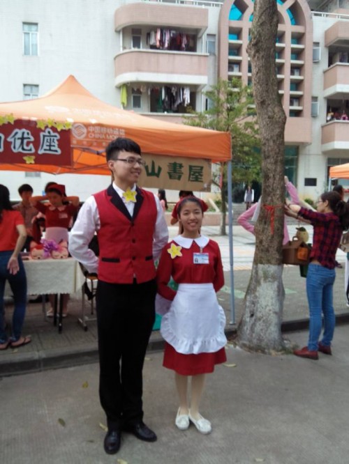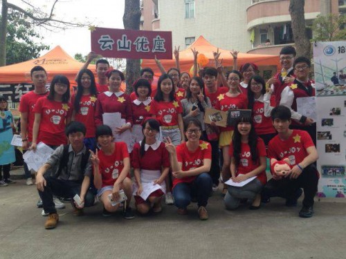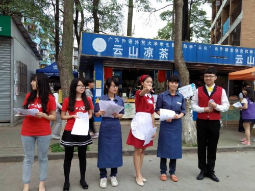 本网讯 2014年3月28日中午,广外云山学生勤工助学(北,下简称“云山勤工”)的各实体和职能部门在学生宿舍12栋前的校道上进行摆摊宣传。当天,广外云山优座咖啡屋(北,下简称“优座”)成员集体出动,助阵摊宣。