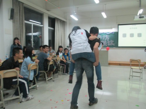 讲话过后便是令人激动又害怕的游戏环节了,大家一边期待好玩的游戏,一边又暗暗害怕着游戏过后的惩罚,果真是矛盾啊!第一个游戏便是男女生抱团游戏,男女生乱报一通,现场一片混乱,一片笑声。简单的游戏后,茶坊人便开始为大家呈现一个关于朱元璋的古老故事。夸张的造型,雷人的台词,搞笑的动作,引来台下观众的阵阵爆笑。欢笑过后,温情的游戏继续。接下来的便是男生蒙眼背女生的甜之背游戏,报亭的男生,茶坊的女生,就这样背着,走着,玩着…随着歌声响起,亭宝们的优美的舞姿渐渐地进入大家的视野,缓缓流淌的音乐,像是在诉说着一段美妙的爱情故事,台下的观众尽情地享受着这一份美好。