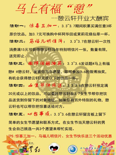 除了官场的微博抽奖、明信片赠送和“女生节快乐送”的送货上门服务。今年女生节,憩云轩还推出了名为“惊喜三加一”的3.7元换购活动,可换购许多紧俏饮品。此外,还有重头戏的“心想事成”活动。不少女生在憩云轩的微博和店面写下了心愿,憩云轩的男员工们抽取了其中的一些,根据女生们留下的联系方式,为她们实现心愿,并送去来自憩云轩的祝福。