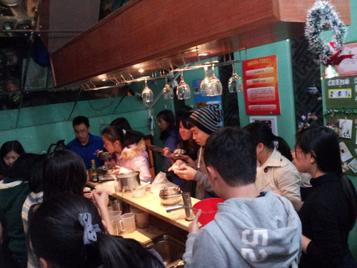 傍晚时分,员工们陆陆续续地来到憩云轩帮忙,他们一边看着“厨娘”们麻利地搅动着饺子馅,一边互相讨教包饺子的方法,憩云轩里一阵欢声笑语。等水煮开之后,大家把形状各异的饺子放进锅里,然后就像饿坏的孩子一样,围在吧台外眼巴巴地盯着锅里的饺子。每一次饺子煮好后,不一会儿就被大家抢光了。除了饺子之外,员工们还准备了青菜、面条和肉丸。随着丰盛的食物不断出锅,大家的热情也不断高涨。