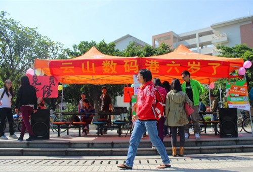 本网讯 今年是云山广源数码港(南,下简称“数码港”)成立的六周年。为此,11月26日及27日,数码港在隧道口进行摆摊庆祝。这次摆摊除了有数码港的看家本领电脑义修外,还有游戏节奏大师、美食派对、“快闪”等精彩活动,奖品丰厚,受到同学们的追捧。