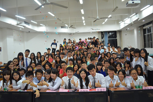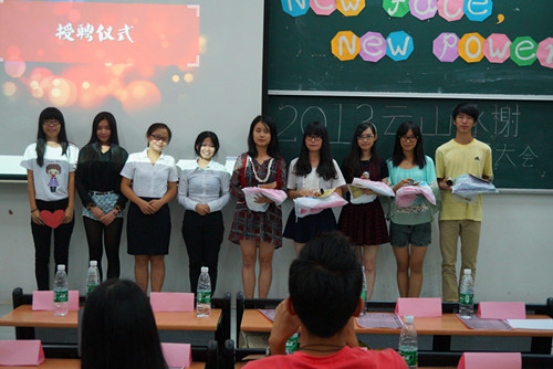 本网讯11月3日晚,广外云山水榭(南,下简称“水榭”)在教学楼F215举办了以“New Face,New Power”为主题的2013-2014年度员工大会。水榭的前任及现任管理层和全体新员工参加了此次会议。会议旨在给离职员工饯行,并为通过考核的新员工举行转正仪式,且让新老员工相互认识,促进他们之间的感情。