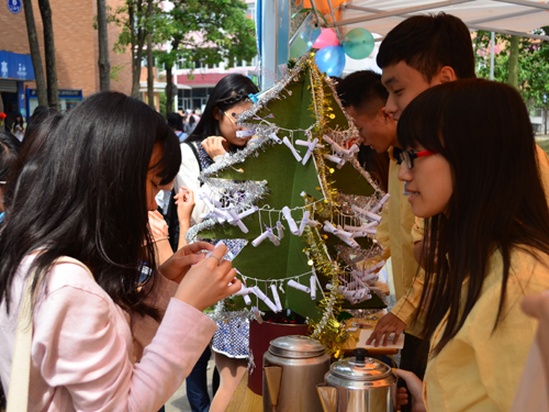 据记者了解,为了举行这一次三周年庆摊宣,答谢一路以来支持憩云轩的顾客们,市场部的成员在策划筹备、装饰设计等方面都颇费心思。当天活动中,除了推荐憩云轩新品“三珍奶露”之外,他们还特别策划了三个小游戏,分别是猜杯子、猜饮品和拼图。参与游戏的学生们都乐在其中,现场不时传来阵阵笑声。而让我们眼前一亮的是那棵“礼物圣诞树”,不仅装饰精美,更挂满了一张张写有神秘礼物的小纸条,别出心裁的设计吸引了众多学生。此外,若当天生日的学生来参与活动,还能得到由憩云轩精心准备的礼品。这次活动真的是惊喜不断,精彩连连!
