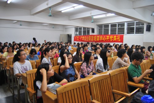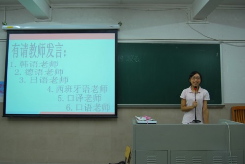 开学典礼第三环节是各班教师代表发言。老师们都以幽默生动而富有各语种语言特色的方式跟大家简要作了自我介绍和课程介绍,并希望与学员们一起学习、共同奋斗。其中,日语老师作为已保送本校研究生的大四在读学生。她坦诚,虽然近年来由于钓鱼岛问题日语专业学生就业情况不尚乐观,但在广州,日语仍然是除英语以外的第二大语言,广交会时日语翻译仍颇受欢迎。与此同时,她也强调,日语入门容易深入难。不管学员们是出于什么原因学习,想要学到成果,必须深刻了解过程是艰难的并坚持下去。