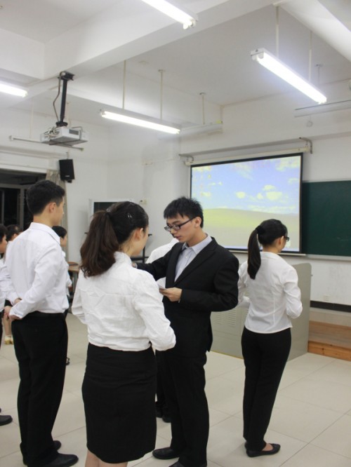 晚上七时,一身正装的啡屋服务员到齐,加强培训便立刻进入前奏。首先,现任副经理庄丹丽在台上为服务员详细介绍重要接待时的礼仪要求,普及礼仪常识,并帮助他们复习服务技能。然后,啡屋现任酒水部部长张敏,根据9月份的服务员考试做出点评,指出他们酒水知识方面的仍需努力的地方。在她的一句“接下来就是残酷训练的环节了”后,“地狱曲”随之奏响。