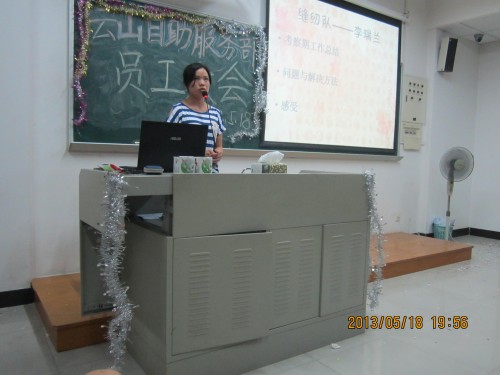 本次晚会的第一环节是5月份的员工大会。会前,自助全体员工合唱自助之歌《我们的光芒》,每个员工都深情专注地唱起:“自助站将永放光芒”,动听的歌声萦绕教室。下面是两位经理、各考察期主管、考察期财务人员和考察期专员的工作汇报。认真出色的工作汇报获得了在场所有人员的热烈掌声。