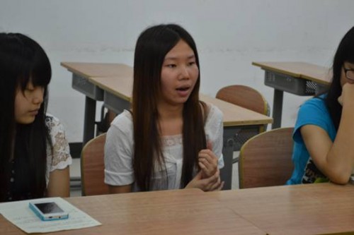 接下来是财务部实习主管洗敏清的发言。她提到,如果要给自己实习期间打分数,她会打60分,而在她进行实习项目的同时,由于洗敏清是班干部需要负责该班中国文化节活动的开展,所以她给自己加10分,因为她的两项工作中均能顺利完成,所以最后给自己的表现打了70分。