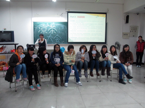 现场的人被分成5个小方块并靠墙分坐着,大家在享受桌上美味零食之余也尽享游戏与表演的欢乐。开门游戏是大家再熟悉不过的“击鼓传花”,其亮点在于惩罚方式,有四个选项供选择。其中一个男生抽到了角色表演,表演的是还珠格格中“小燕子有哥哥” 片段,让人笑不拢嘴。还有抽到劈“一字马”和“猪脸五连拍”,精彩不断,笑声不停。还有“嘴嘴传杯拼水量”游戏把团队的协调与团结表现得淋漓尽致。接下来的重头戏是“非诚勿扰”了,在5个小组中每组选出2个女生代表组成10个女嘉宾,并有3个男嘉宾自愿上场。一位男嘉宾介绍道:“我没车,没房,屌丝一个,但我有的是切糕。”场上顿时爆笑一片。另一位男嘉宾信心满满地说:“我有车,但是2人坐的自行车;我有房,但是4人住的宿舍房;我是高,富,帅。”更是把大家引到了爆笑高潮。