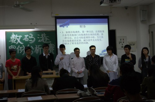 晚上八时许,评委、各队参赛选手和其他数码港人齐聚在教学楼E405,主持人宣布数码港第一届案例分析大赛正式开始。接下来是本次比赛流程介绍和队伍介绍。一番介绍过后,进入决赛的队伍分别上台展示,每队展示之后由评委根据展示内容进行提问,各评委根据队伍展示内容和提问环节的表现现场打分。展示过程中,各队伍的参赛选手条理清晰、思维敏捷、讲解流利,其专业的用语、出众的想法赢得了台下阵阵掌声。
