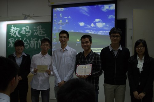 点评环节结束后,评委们进行了十分钟左右的讨论和计分,最终评选出一、二、三等奖和最佳演讲者。获得一等奖的是吴鉴浩、李声鹏、林满琪和王轶捷所在的第一队,同时最佳演讲者也被该队的吴鉴浩收入囊中,获得二等奖的是许泽梁、黄添彦和黄子天所在的队伍,获得三等奖的是李业超、谭森瑜和卢采妮所在的队伍,数码港的三位经理分别为三支队伍和最佳演讲者颁发获奖证书和奖金,各队伍也和经理、导师一起合影留念。