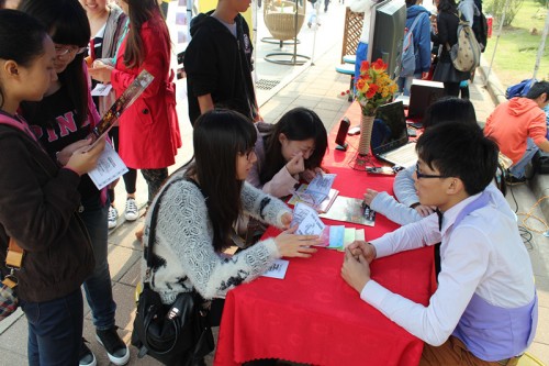 同时,水榭KTV也积极配合“全世爱”音乐会的宣传,开设了游戏摊位。同学们参与互动游戏,一分钟内可以把“广外”或者“水榭”的logo拼出来的同学可获得KTV体验。于是,音乐会摆摊现场更加热闹,前来玩游戏或者咨询的同学们都兴高采烈,一度发出欢呼的声音。
