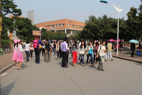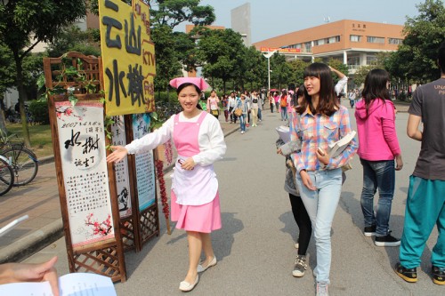 这次活动摆摊声势浩大,摆摊现场更是热闹非凡,小粉红、小粉紫以及水榭员工们个个精神饱满活跃在校道上,他们高喊:“云山水榭音乐会,诠释你的爱。”这一响亮的口号,吸引了很多人前来观看与咨询。水谢经理和主管们也亲临现场亲自为音乐会做宣传,可见水榭对“全世爱”音乐会的重视程度。