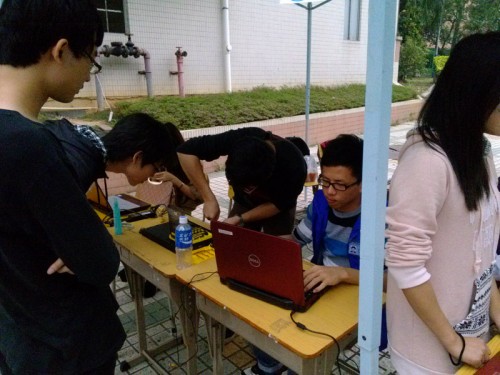 相思河畔12栋楼下,几张桌子一字排开,数台笔记本、显示器整齐地摆放在桌子上,来自数码港维修部的义修队,正在认真地为北校的同学们免费维修电脑。