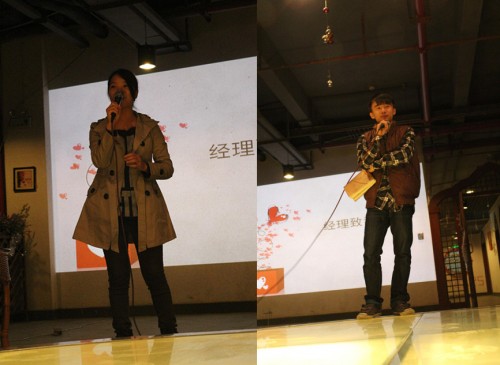 同乐会主持人在一段视频《火》后以猫步神秘出场。在简单的自我介绍后,主持人便邀请了两位水榭的副经理张一戈和潘伟清致辞。两位经理发言中,深深地表达了他们对水榭的爱,与老员工的美好过去以及对新员工的希冀,并且表示感谢新员工为水榭带来新的血液,让水榭变得更加有活力。