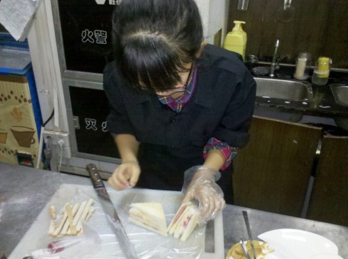 云山书吧本学期的吧员考核项目,分为笔试和实操两部分。实操又包括水果拼盘的摆放、花式咖啡的制作,熟食的烹制以及雪糕蛋糕装饰,咖啡拉花作为附加分题。每一轮考核完毕由三位资深吧员作为评委进行点评,并给出最终得分。