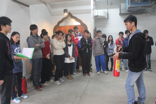 会议主要分为三个方面的内容,分别是:消防讲解、灭火器实操和消防演练大逃生。在消防讲解这个环节中,培训员首先发了一份消防知识问卷,看大家对消防知识到底了解多少,之后向培训者讲解了消防的重要性,如何预防火灾以及水榭出现火灾如何自救等知识。中间插播了两段视频,其中一段由总务部人员自编自导自演的《火场逃生记》,着重讲述灭火与逃生自救的注意事项:当火灾发生后,首先要保持冷静,根据火势大小作出判断,若火势发展迅速,应拨打校园报警电话39328110或者火警119,注意讲清楚火灾发生地点,着火物品,火势大小以及人员被困情况,切记要留下自己的的姓名和联系方式。若火势自己可以掌控,可以有秩序的进行灭火,寻找捷径引导客人逃生等。