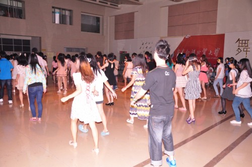 男生轻轻的搂着女生的腰,女生羞涩的搭上了男生的肩,踮起脚尖,提起裙摆,让我的手轻轻搭上你的肩。首次教学由于动作生疏时常发生小碰撞的搞笑画面。等到第二次教学时,原先的舞伴是否走散了呢?可我却偷偷听到有男生在电话联系刚要到号码的舞伴,然后相遇,微笑,原来就是你……