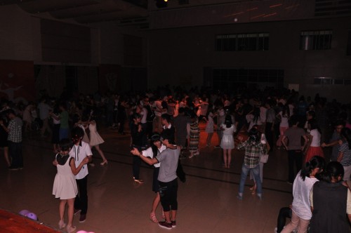 随着主持人宣布今晚的舞会正式开始,耳边立刻响起了舞会的招牌舞曲《super-hero》,舞会的员工从舞池的四周拥入舞池中央,给我们呈现了一曲精彩的劲歌热舞,直接把舞会的气氛点燃了。大家在台下跃跃欲试,教舞者在台上给大家做示范,台下的观众学得津津有味,先往右走四步,再往左走四步,向前,拍手,转圈,跳步。随着音乐,尽情地摇摆。那个时候我们都是superhero。