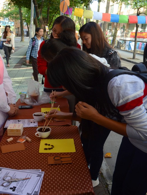 在此次以相约“九”吧为主题的周年店庆活动中,游戏区的啡屋好声音、啡豆夹夹乐、一“掷”即中、百变拼图秀、闻香识美酒和寻宝游戏吸引了大量同学的参与。玩家通过游戏收集印章,兑换相应的奖品。一等奖咖啡鸡尾酒套餐,吸引了不少同学为之在各游戏摊位数次奔走。啡屋好声音模仿中国好声音,练的是“气功”:在规定的时间内读完抽中的题目;啡豆夹夹乐比的是使筷子的功力:用筷子把咖啡豆夹出并拼成抽中的图案;一“掷”即中拼的是眼力:把筷子扔进酒瓶内便可获得印章;闻香识美酒更是让同学们对各款洋酒有了进一步的了解……