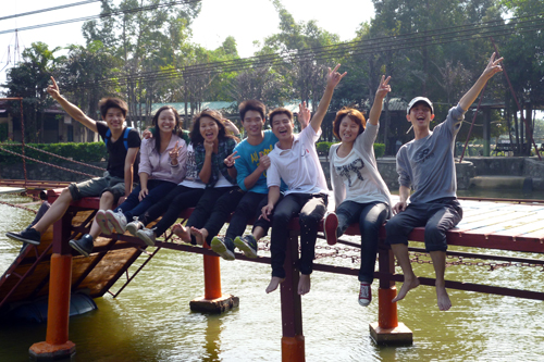 首先进入的是水上游乐区,印入眼帘的是高大威武的雷锋像。大家把烧烤物资安放在烧烤场后各自奔向水上闯关地。水上钢丝、踏水无痕、情侣桥、踏笼飞度、急速圆木、踏走滚桶……各种刺激与挑战让大家使出浑身解数,各显神通,协调的齐步口令式,胆小的平躺匍匐式,无助的空中手吊式,搞笑的狗爬式,抓狂的猴子爬树式……各种窘态暴露无遗,逗得大家笑不拢嘴。其中也增加了不少晴天“湿身娃”。水上的功夫不足满足大家的尽兴,于是又前往山谷游乐区“进军”。湿身后的娃儿仍然沉浸在亢奋的状态,各种赤脚秧歌步和拖鞋甩袜子的搞笑动作频频上演,让大家笑得前俯后仰。接下来的百尺竿头、孤岛求生、空中钢丝、天罗地网、竖网桥、天马行空等让大家乐此不疲,笑声传向山谷久响不停。