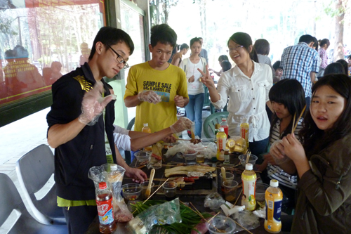 疯狂了一个上午,有的玩累了,有的笑累了,但唯一一样的是大家都饿了。期待已久的烧烤环节终于到来了。鸡翅,肉丸,羊肉,玉米,紫薯等应有尽有,然而对着自己精心烤好的鸡翅,大家首先想到的不是自己而是凉茶坊里关心自己或自己关心的人,各种献“殷勤”让大家感觉到暖暖的亲情和浓浓的情意。