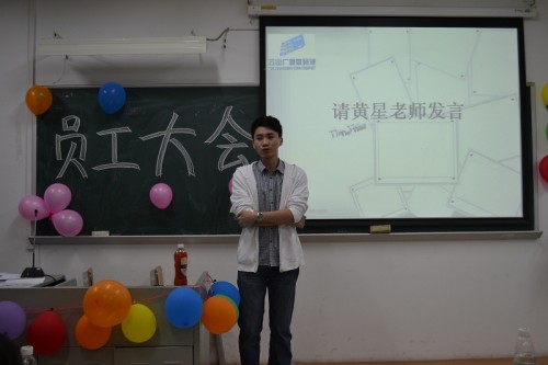 本网讯11月4日晚19:00,云山广源数码港(南,下简称“数码港”或“SMG”)员工大会在A302举行。出席本次员工大会的嘉宾有广外云山学生勤工助学(下简称“云山勤工”)指导老师黄星,云山勤工党支部副书记钟有材,常务董事蒋家宽。