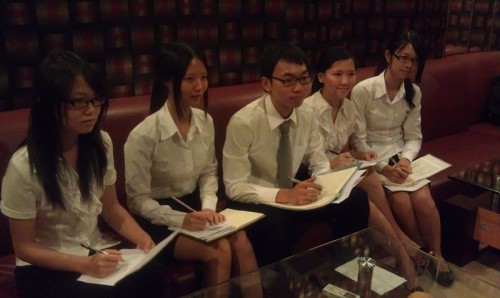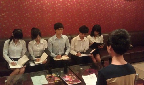 本网讯10月21日,19:00——22:00,云山水榭(南,下简称“水榭”)于水榭二期KTV、水榭网络沙龙会议室、水榭员工休息室等地举行了2012年水榭秋季招聘的第三次面试。其中参加本次部门面试的部门有咖啡屋品牌运营部、KTV品牌运营部、网络沙龙品牌运营部、总务部、人资部、行政部、财务部、广告部,酒水部,由于吧员的工作性质不一样则另设面试时间。