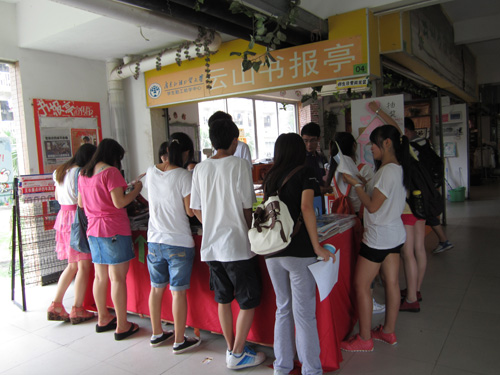 本网讯:5月29-30日,云山书报亭(南)为酬谢新老客户,在3栋创业园云山书报亭与凉茶坊的交界处举行大型促销活动,吸引了大批学生前来购买。