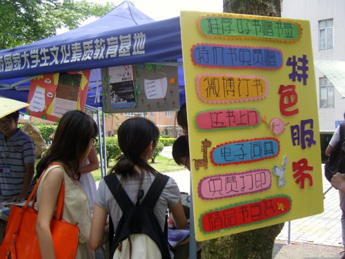 活动中书屋为不少前来购书的同学提供了精品书包装、订书、送书上门等服务。