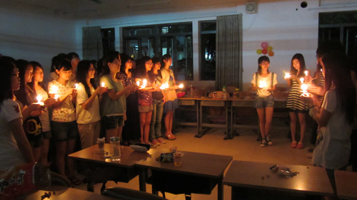 在《祝你一路顺风》的音乐声中,大家燃起蜡烛