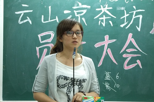 本网讯 4月7日,云山凉茶坊(南,下称凉茶坊)在教学楼举行了员工大会。副经理候选人詹玲玲主持了会议。