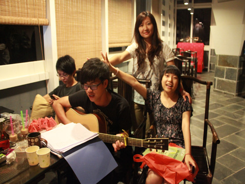 在小站墨绿的小片竹林里,暖暖的橘黄灯光映照着小站员工Bony。他动情地演唱,认真而投入。其他员工围坐一旁,安静地倾听吉他乐曲带给大家的放松和舒畅。