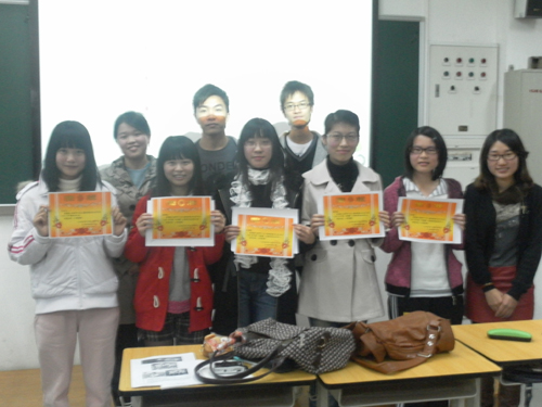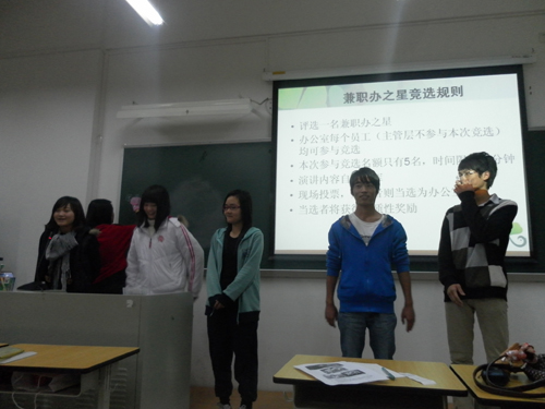 最后,来宾及经理对本学期的优秀员工(赖晓琳、陈嘉媚、饶东玲、王秋曼)和经过众员工投票选出的“兼职办之星”曾晓冬进行了颁奖。