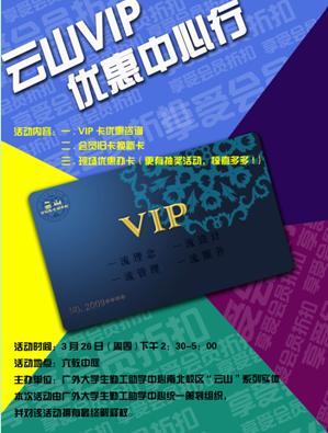 附言:云山VIP卡推广活动后实体办卡方法:在书屋、小站、咖啡屋、网俱、健身室一次性消费满50元,在精品屋一次性消费满38元,加5元工本费后可办理中心会员卡。