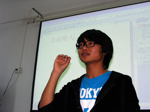 在另外一个游戏“猜字”中,在场的同学们更加投入。你能够比划出成语“踽踽独行”吗?看网球联盟的会员们是这样做的:拿起两个桔子“桔桔(踽踽)”,然后一个人行走。猜想的同学不加速思索地就想出了答案,其他在场的同学不禁拍手叫绝。这次输掉比赛的刘卓家嘴含香蕉唱歌,全场再次笑得不可开交。