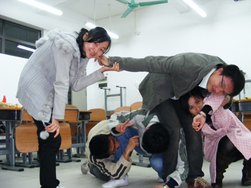 在场的人员全部笑倒,参与游戏的同学更是一脸痛苦地摆出千奇百怪的造型。这是怎么一回事?“脚踝触左肩”“脖子碰后背”“下巴和小腿”……这就当晚的其中一个游戏“身体对对碰”。在场的人员被分为两组,每组各派出数名人员,每次抽签,将抽中的部位触碰在一起。于是,现场出现了各种奇怪的造型。无论是游戏的参与者还是旁观的观众,无不笑成一团。最后先支持不住的一方就要接受另一方的“混合饮料”大惩罚,而接受惩罚的黄建都同学痛快一饮而尽。