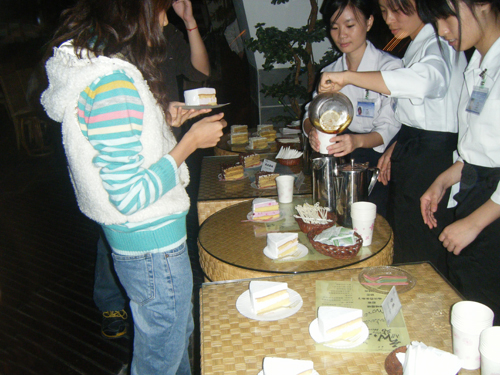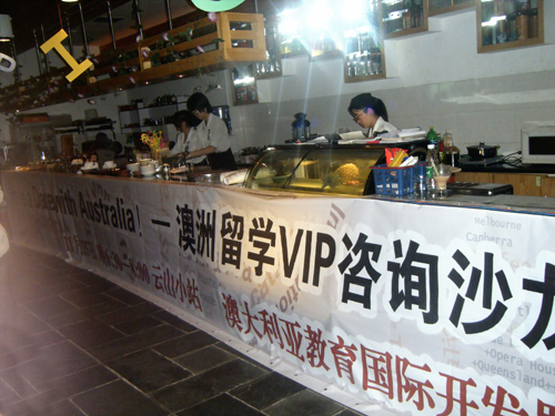 IDP在营业B区的舞台上进行宣讲,并借助投影仪让同学们看得更清楚;小站在营业A区提供自助餐,让来宾自由选择。当活动进行到精彩部分的时候,很多人都不愿意离开座位,细心的服务员则主动上前为有需要的同学添加食品和饮料。前来咨询的同学在听宣讲会的同时,一边享用美食,现场气氛十分轻松愉快。