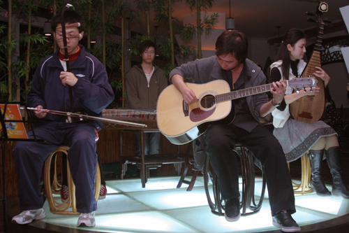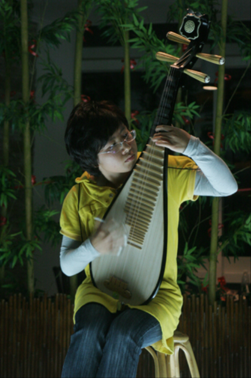 暖场表演是来自校艺术团器乐队的乐曲串烧演奏。中国的古筝、琵琶、二胡,西方的吉他、电子琴;一阙流连千古的《水调歌头》,一首风靡当下的《菊花台》,中西结合,古今交错,给予人独特的听觉享受。顾客们顿时陶醉于无限的意境之中。