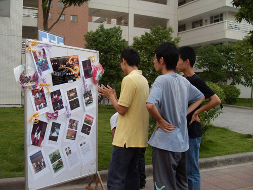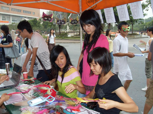 10月28日,周末舞会开始进行校道摆摊宣传,同时出售舞会门票以及面具。神秘的主题,各式各样的面具,别有的风味,吸引了很多感兴趣的同学,他们都纷纷前往咨询,询问具体情况,并提前买票和挑选面具。