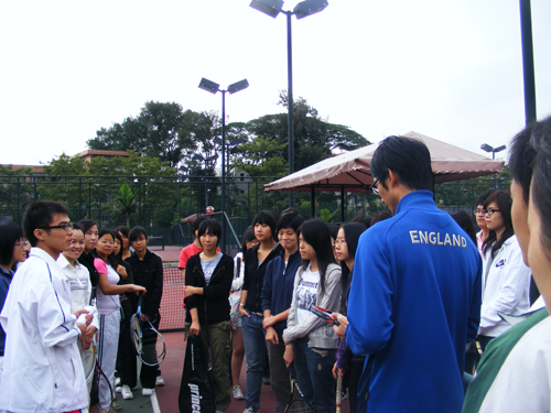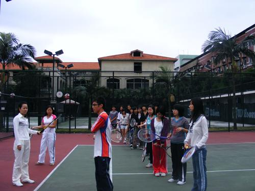 9点40分,见面会结束,进入教练教学时间。会员被分成两组,由两名联盟教练分别教导网球基本技能,这一次的教学重点是正手发球。教练们先集中会员讲授动作要领,作动作示范,接着让会员练习,教练一一指导和纠正会员的动作姿势。会员们都很投入地练习,并相互交流学习的情况,互相纠正对方的动作和姿势。
