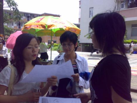 本网讯5月28日中午,云山兼职服务办公室(北)外语部的人才建档活动在13栋门前的校道上举行。此次人才建档活动主要目的是为了征集译员、更新档案,另一方面是为兼职办接下来的一系列活动(如市场部的礼仪、司仪、模特建档活动,兼职办即将举办的暑期兼职实习招聘会)“打头炮”。