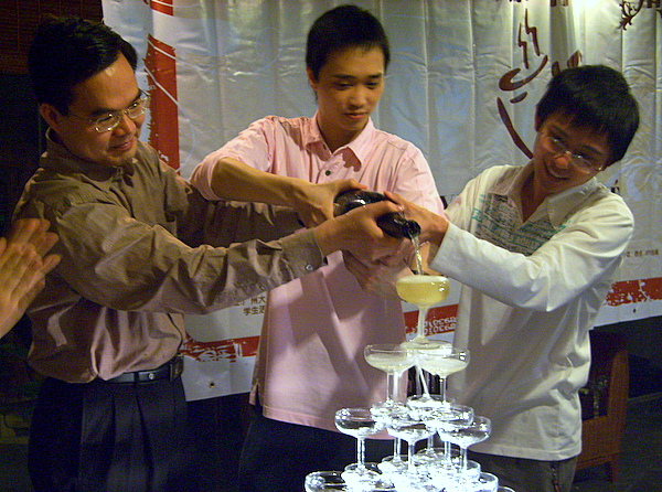 首先,学生处处长植秀聪、中心党支部书记陈杰超以及水榭首任经理黄崇嘉,副经理邹同发等人一起开香槟,为水榭的生日举杯。现场,香槟的香味四溢,水榭的灯光绚烂,嘉宾神采飞扬,笑容满面,一同欢呼“happy birthday”。